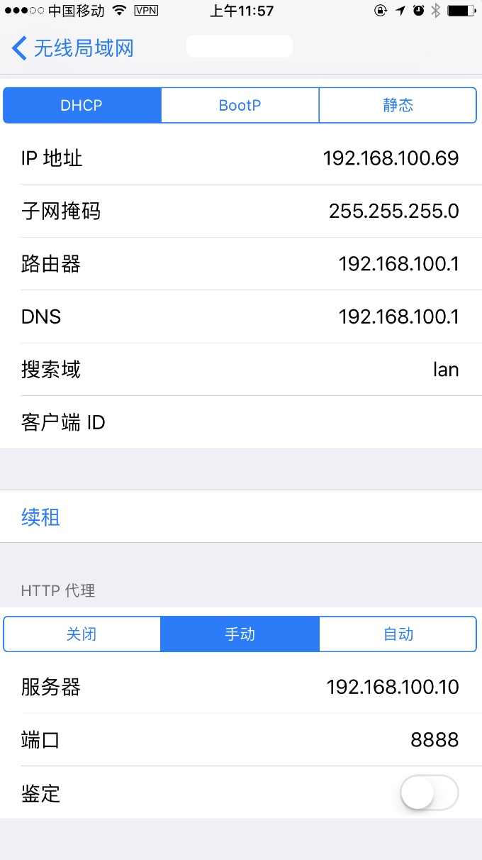 3.设置代理,选择手动,服务器端口为你开启Charles服务的计算机ip地址,端口号为你设置的代理端口号,默认为8888
